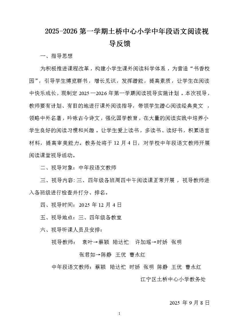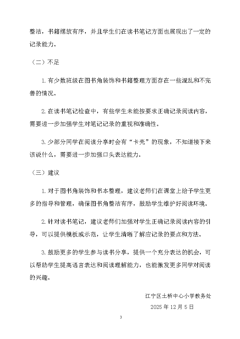 2025-2026第一学期土桥中心小学中年段语文阅读视导反馈